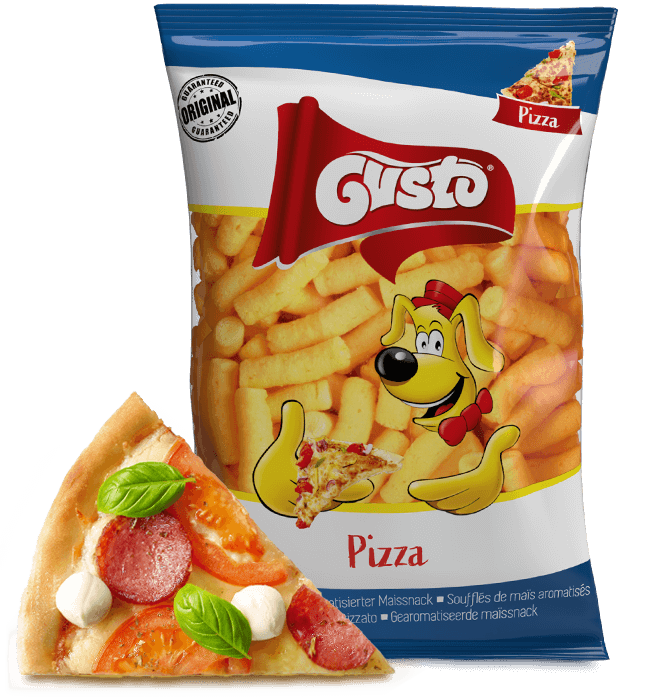 Chrupki kukurydziane Gusto w wersji na słono. Klasyczny smak pizzy w chrupkach Gusto teraz w większym opakowaniu. Wyprodukowane na bazie składników naturalnych: pomidora, cebuli, aromatycznych ziół i ekstraktu z papryki (naturalny barwnik), bez GMO.