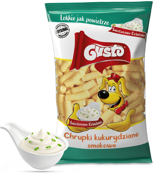 Poznaj oryginalny smak chrupek naturalnych Gusto – kwaśna śmietana z cebulą! Delikatne, puszyste a jednocześnie idealnie chrupiące dzięki innowacyjnej technologii i wyjątkowej recepturze tworzenia. Subtelny smak śmietany podkreślony wyrazistą cebulą to połączenie, którego na pewno nie skończysz na jednej paczce! Ten łagodny duet został stworzony specjalnie dla osób, które od tradycyjnego smaku cebuli wolą jej delikatne wydanie połączone z subtelną nutą śmietany. Wszystko dopełnione idealną chrupkością, którą charakteryzują się chrupki Gusto!