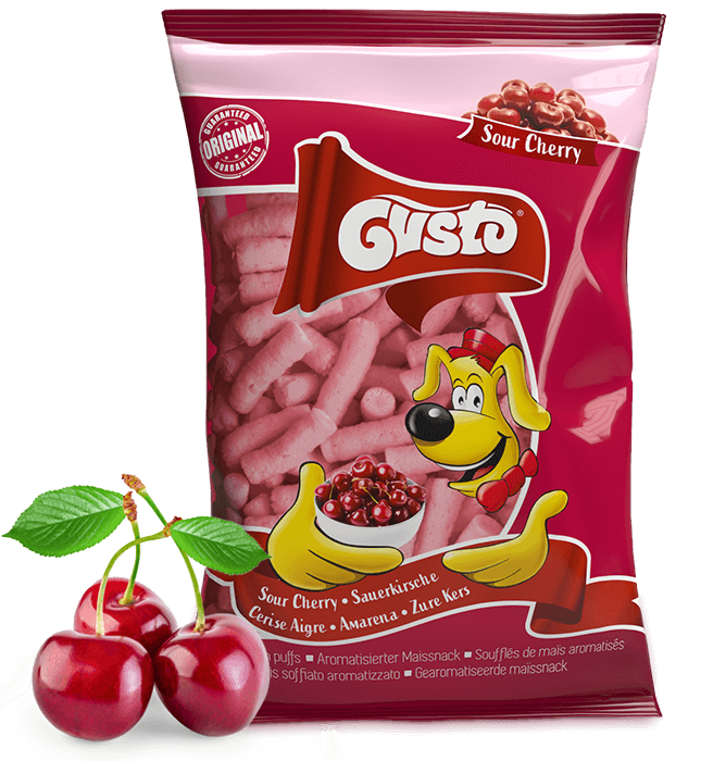 Chrupki kukurydziane Gusto w wersji na słodko. Spróbuj unikatowego wiśniowego smaku chrupek Gusto. Wyprodukowane na bazie składników naturalnych: ekstraktu z buraka cukrowego oraz suchej masy wiśniowej (z koncentratu miąższu wiśniowego), zbogacone Witaminą E. Bez GMO i ulepszacie smaku.